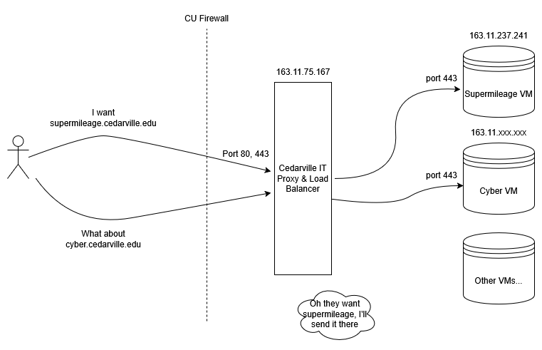 To save you from the troubleshooting rabbit trail, there are some interesting behaviors as a result of the routing within Cedarville’s network. Cedarville, for security and for load balancing, has a load balancer server between the outside world, and the server hardware our Supermileage VM runs on. This load balancer forwards all web traffic, no matter what port it originates from, to port 443 on our VM. So, even HTTP traffic will appear through port 443 on our VM. Weird, huh? We thought so too. See this diagram to get a visual idea of what I am talking about.